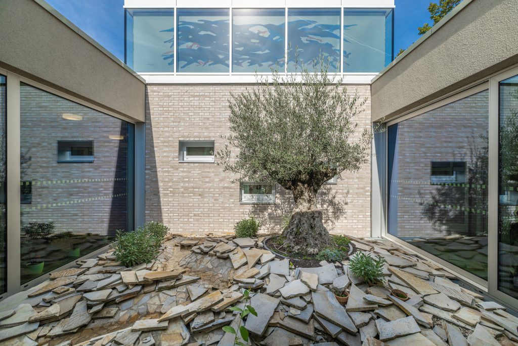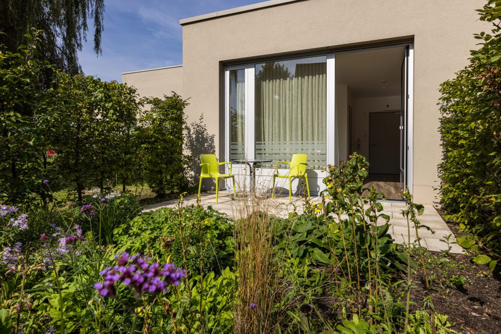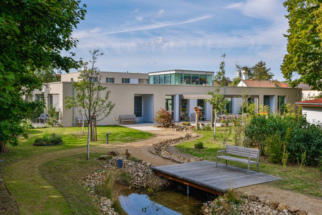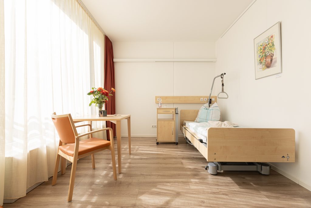 Das Haus bietet Platz für acht Gäste und hält Übernachtungsmöglichkeiten für Angehörige bereit. Die freundlich und behindertengerecht ausgestatteten Zimmer sind ebenerdig erreichbar und mit einem modernen Bad ausgestattet. Jedes Zimmer verfügt über eine eigene Terrasse und kann nach individuellen Wünschen gestaltet werden. In dieser Atmosphäre ermöglichen wir gemeinsam mit Angehörigen, Partnern und Freunden, die Lebenszeit bis in die Todesstunde nach eigenen Vorstellungen zu gestalten. Mitten im Hospiz befindet sich ein „Raum der Stille“ und ein kleiner Innenhof mit einem 250 Jahre altem Olivenbaum und einer Wasserquelle.